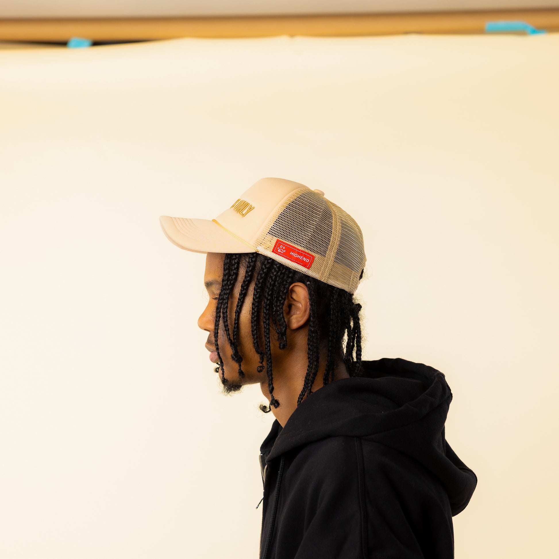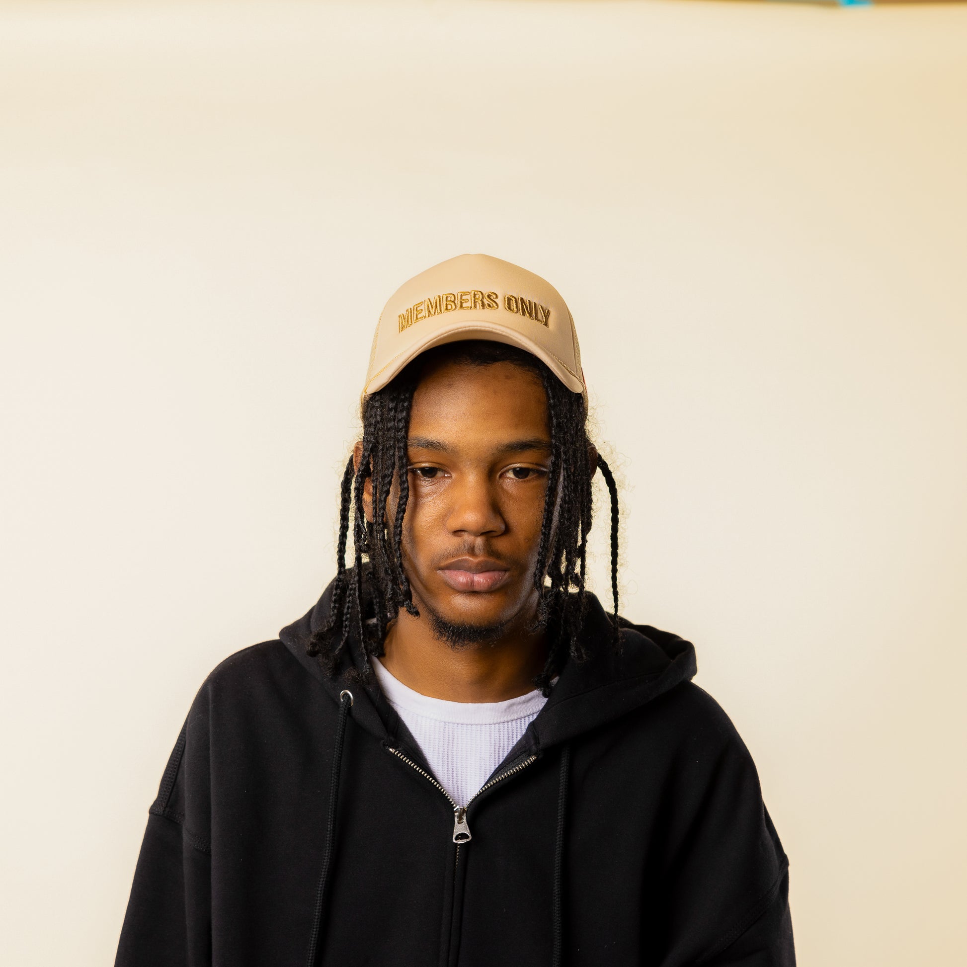 Tan Hat. Brown "MEMBERS ONLY". Red "HIGHEND" Tag.